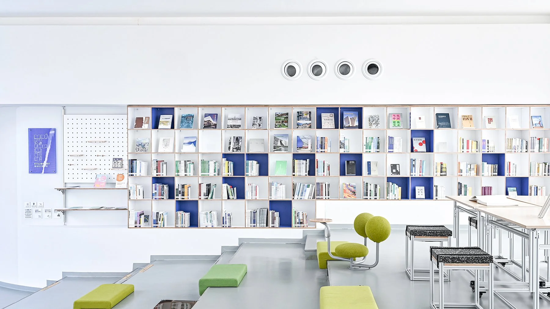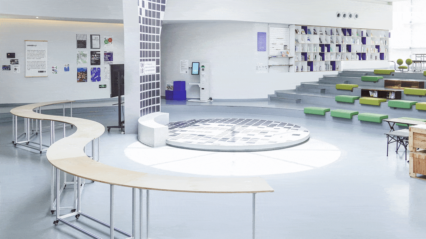 我们应用可持续材料设计并制作了模块化组合弧形墙、灵活移动弧形拼接桌、可移动升降调节桌、拆卸式再生模块凳子及铝型材书架,塑造了阅览、展览及活动空间,给周边居民提供了开放的学习、交流和放松的场景。